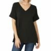 A casual curved hem and flared fit make this stretchy, lightweight tee a laid-back layer that will keep you comfortable as you go about your busy day.