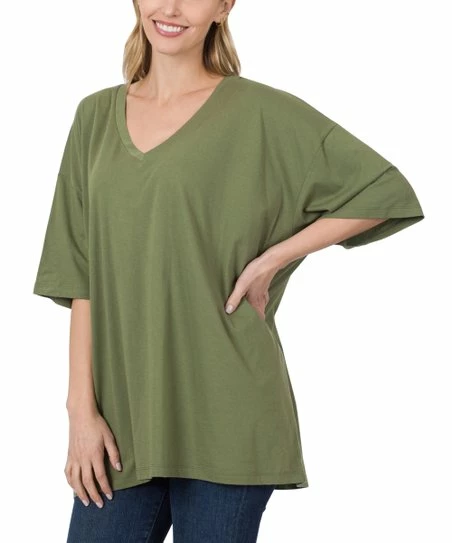 Flow through your day in this cotton tee sporting an oversize, longline silhouette with a wide v-neck and drop-shoulder seam.