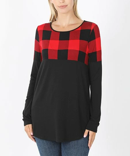 Discount πŸŽ‰ Zenana Black Buffalo Check Long-Sleeve Curved-Hem Tee – πŸ‘© Women πŸ˜‰