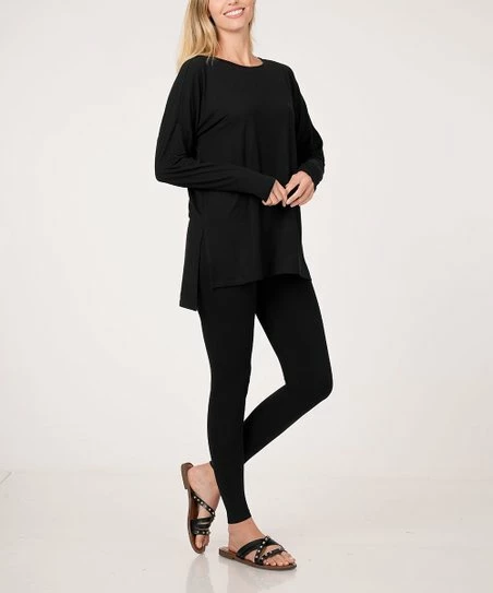 Longline crewneck top with slit sides in a solid hue and matching leggings.