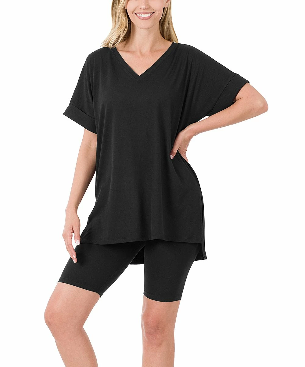 Refresh your casual wardrobe with this matching set that includes stretchy bike shorts and a relaxed tee with cuffed sleeves and a hi-low hem.
