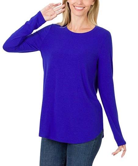 Update your basic casual-chic style with this long-sleeve crewneck tee featuring a curved hem and a solid hue.
