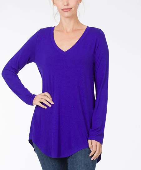 A hi-low hem updates this versatile v-neck top with a trend-right touch, while stretch-blend fabric ensures a just-right fit.