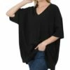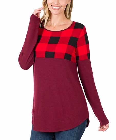 Bring festive cheer to your casual-chic rotation with the buffalo check color block pattern of this long-sleeve tee made with a soft rayon blend.
