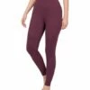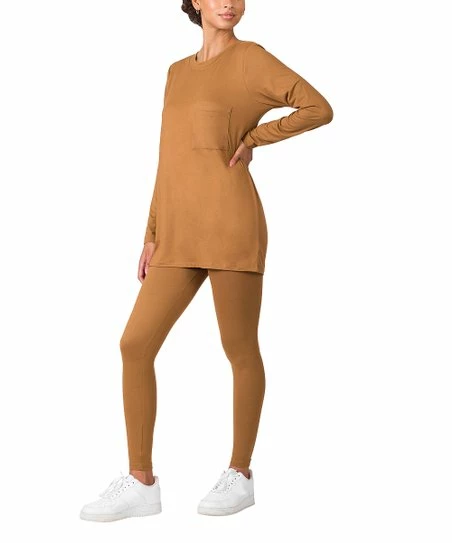 - Includes deep camel crewneck long-sleeve pocket top and leggings (two pieces total)