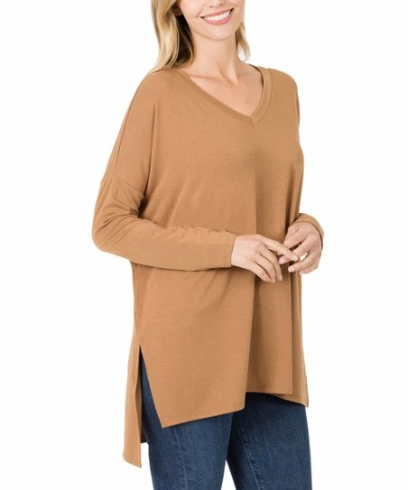 Flash Sale πŸ₯° Zenana Deep Camel V-Neck Long-Sleeve Hi-Low Tunic – πŸ‘© Women & Plus πŸ˜‰