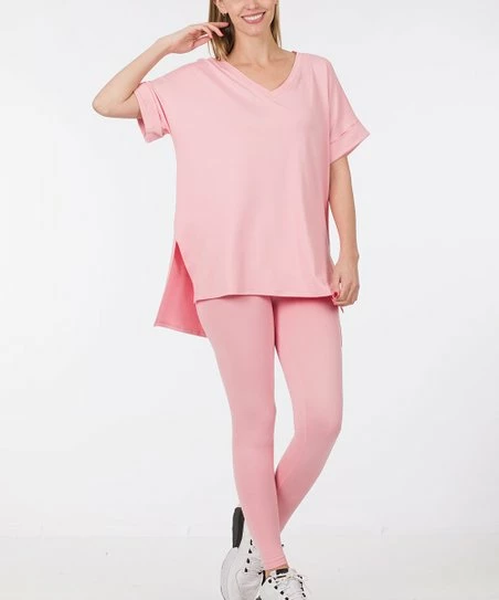 Step up your casual collection with this set that features a flattering V-neck tee and a pair of leggings in a coordinating hue.