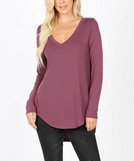 Elevate your casual wardrobe with this light and stretchy v-neck tee boasting a flattering solid hue and chic curved hem. Pair this look with your favorite jeans or leggings for an everyday look you’ll love.