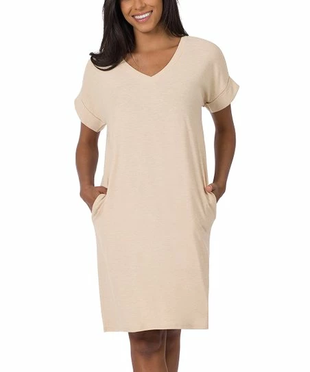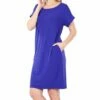 Enjoy comfort and versatility with this stretch-blend shift featuring a relaxed silhouette with roll-cuff sleeves and a v-neckline. A solid hue invites creative styling, and side pockets offer a practical touch.
