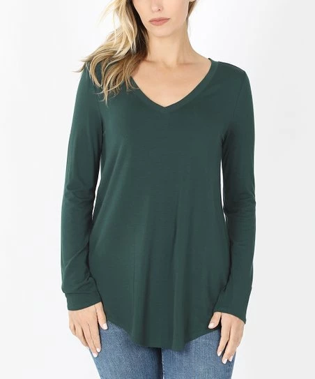 Wholesale 🎁 Zenana Hunter Green V-Neck Long-Sleeve Curved-Hem Tee – πŸ‘© Women πŸ””