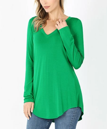 Elevate your casual wardrobe with this light and stretchy v-neck tee boasting a flattering solid hue and chic curved hem. Pair this look with your favorite jeans or leggings for an everyday look you’ll love.