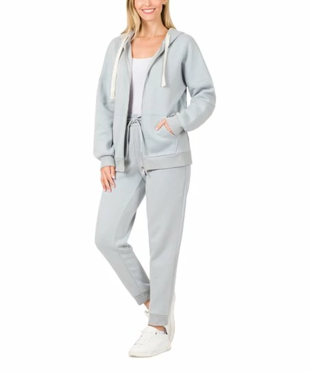 - Includes light gray zip-up hoodie and light gray sweatpants (two pieces total)
