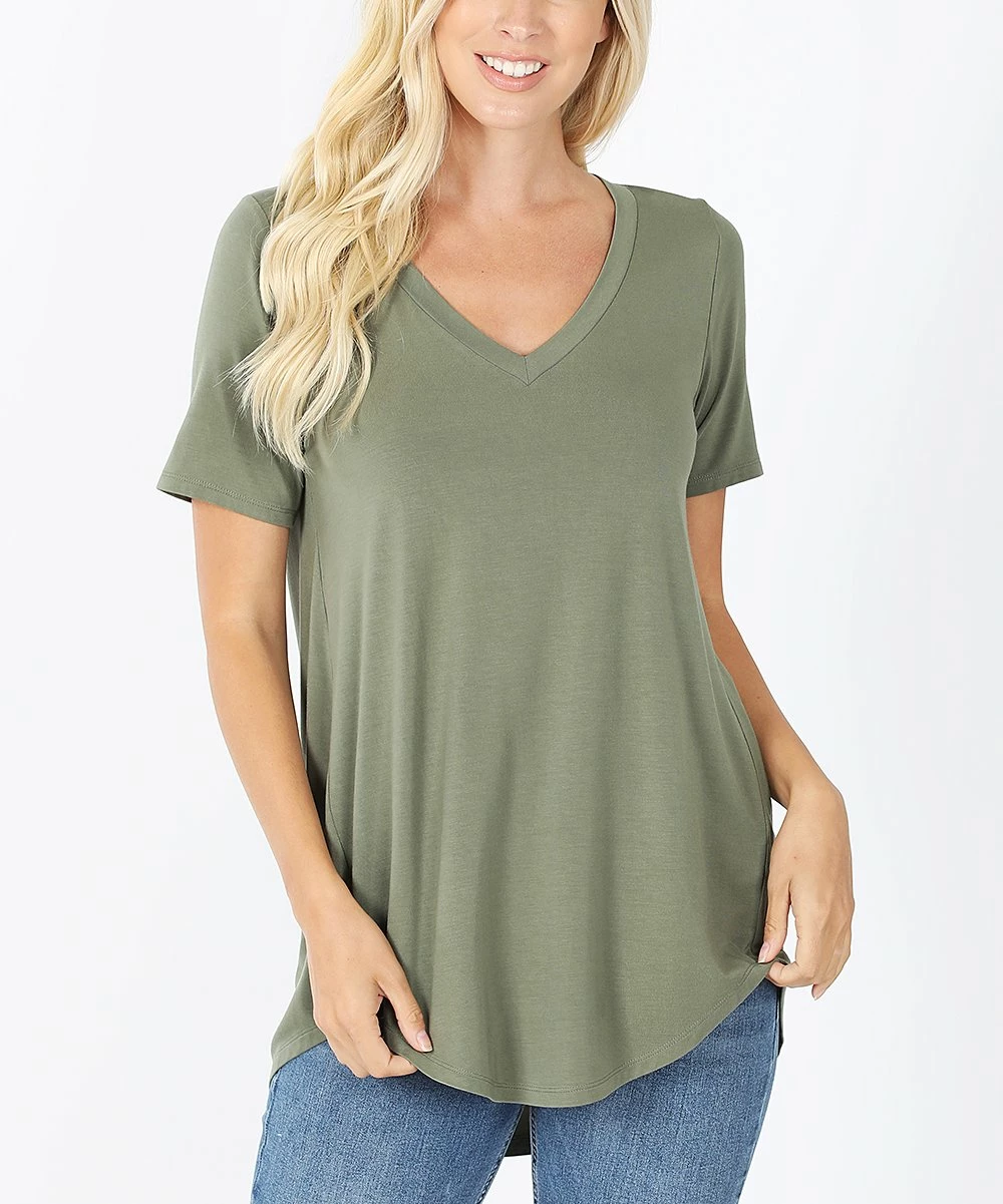 Enhance your collection of everyday essentials with this casually comfortable tee infused with a touch of stretch and flaunting a swingy hi-low hem and a face-framing v-neckline.