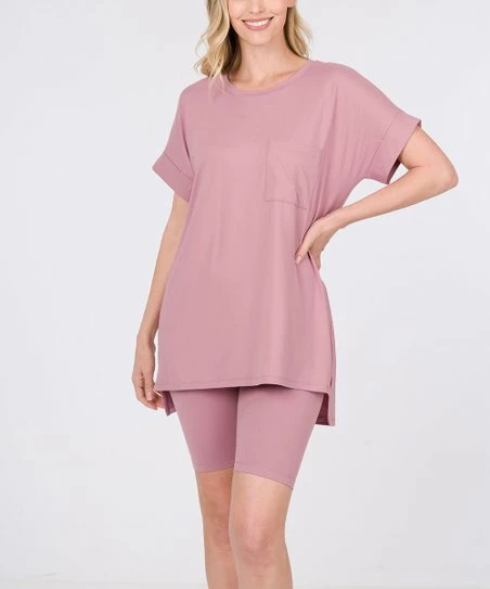 - Includes light rose tee and matching bike shorts (two pieces total)