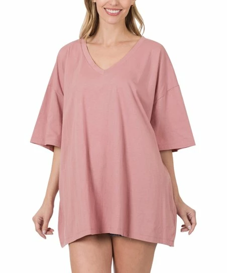 Budget ✨ Zenana Light Rose Drop-Shoulder Longline Box V-Neck Tee – πŸ‘© Women & Plus πŸ‘