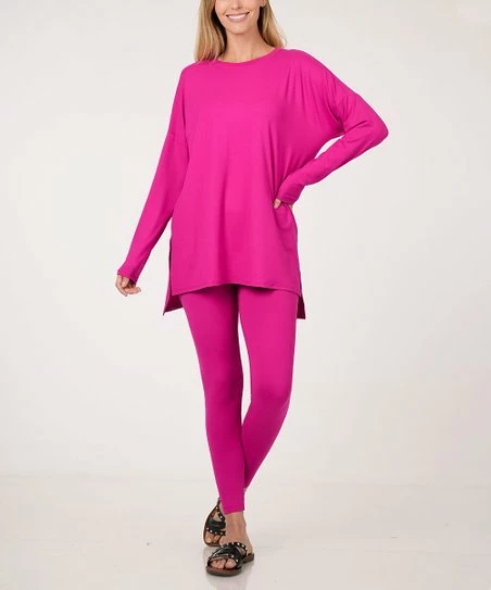 Longline crewneck top with slit sides in a solid hue and matching leggings.