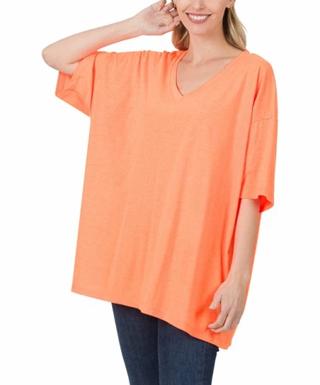 Flash Sale 🀩 Zenana Neon Coral Drop-Shoulder Longline Box V-Neck Tee – πŸ‘© Women & Plus πŸ˜€