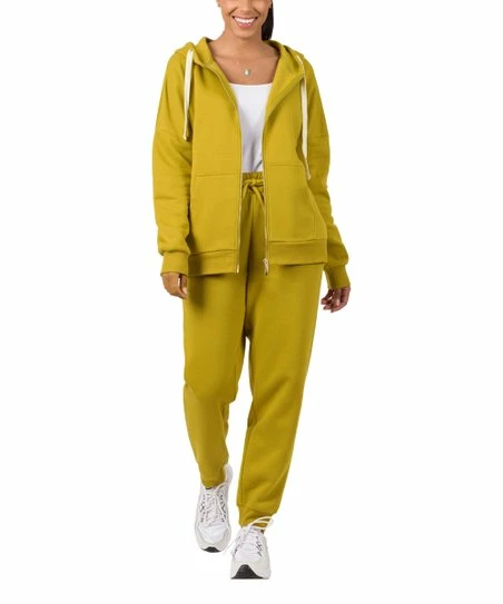 - Includes olive mustard zip-up hoodie and olive mustard sweatpants (two pieces total)