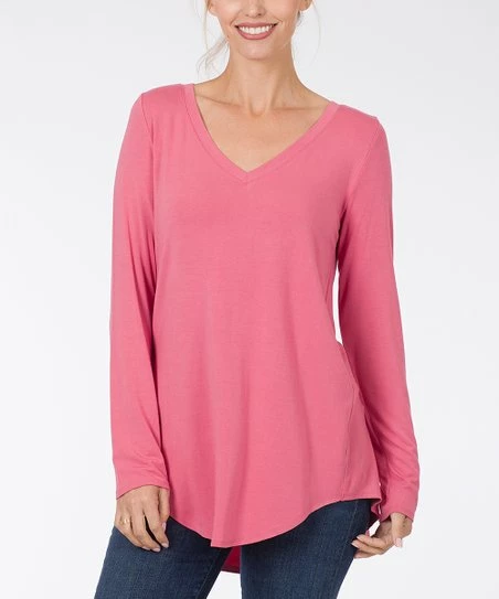 Promo πŸ‘ Zenana Rose V-Neck Long-Sleeve Curved-Hem Tee – πŸ‘© Women 😍