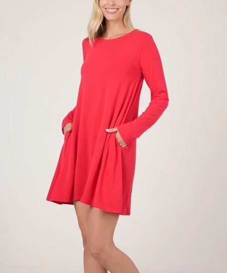 Flowy tunic dress featuring long sleeves, a simple crew neckline and side pockets.